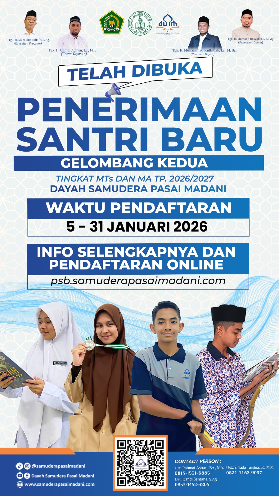 Aceh Besar, 6 Januari 2026 – Setelah pelaksanaan Penerimaan Santri Baru (PSB) Gelombang Pertama Dayah Samudera Pasai Madani berjalan dengan tertib dan mendapat sambutan positif dari masyarakat, pihak dayah kembali membuka PSB Gelombang Kedua Tahun Pelajaran 2026/2027 untuk Tingkat MTs dan MA.