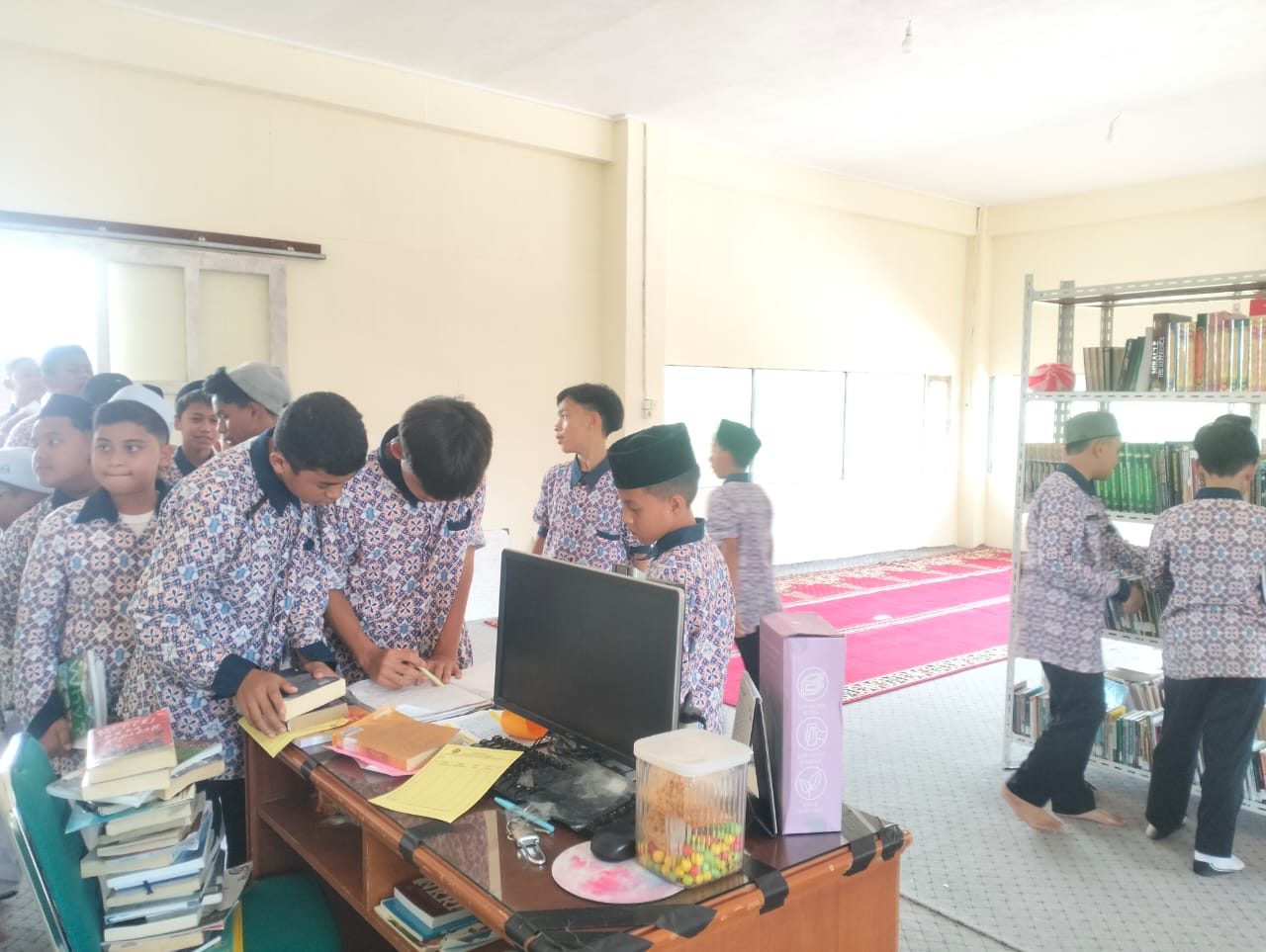 Foto: santri saat meminjam buku di perpustakaan Dayah Samudera Pasai madani (oleh ustzh Lala)